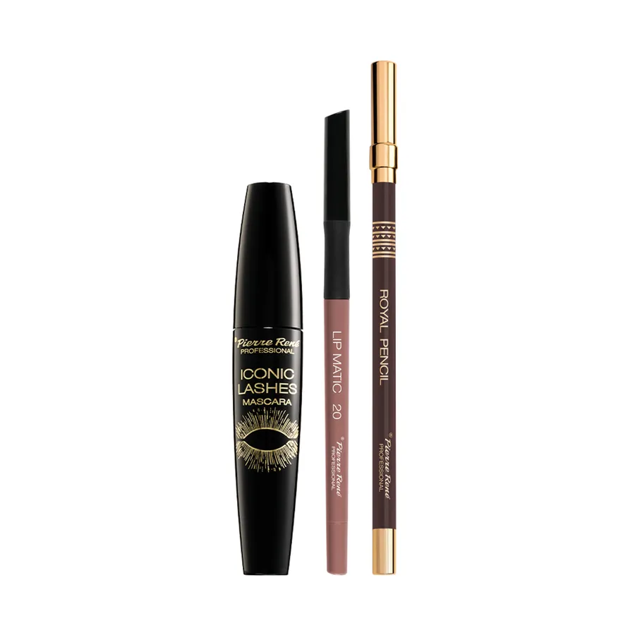 Kit con productos imprescindibles de maquillaje: máscara, lápiz de ojos y labios.