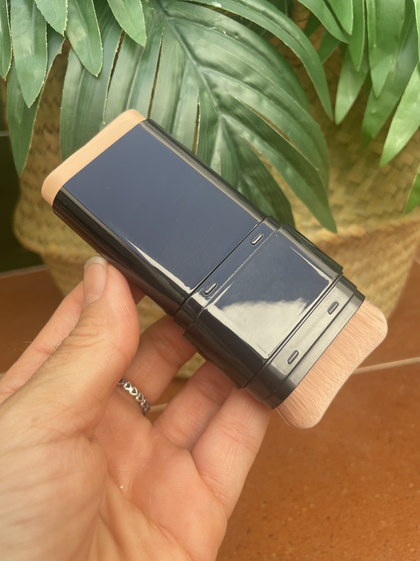 Por un lateral tiene la barrita en stick y por el otro tiene la brochita para extender el color mas uniformemente.